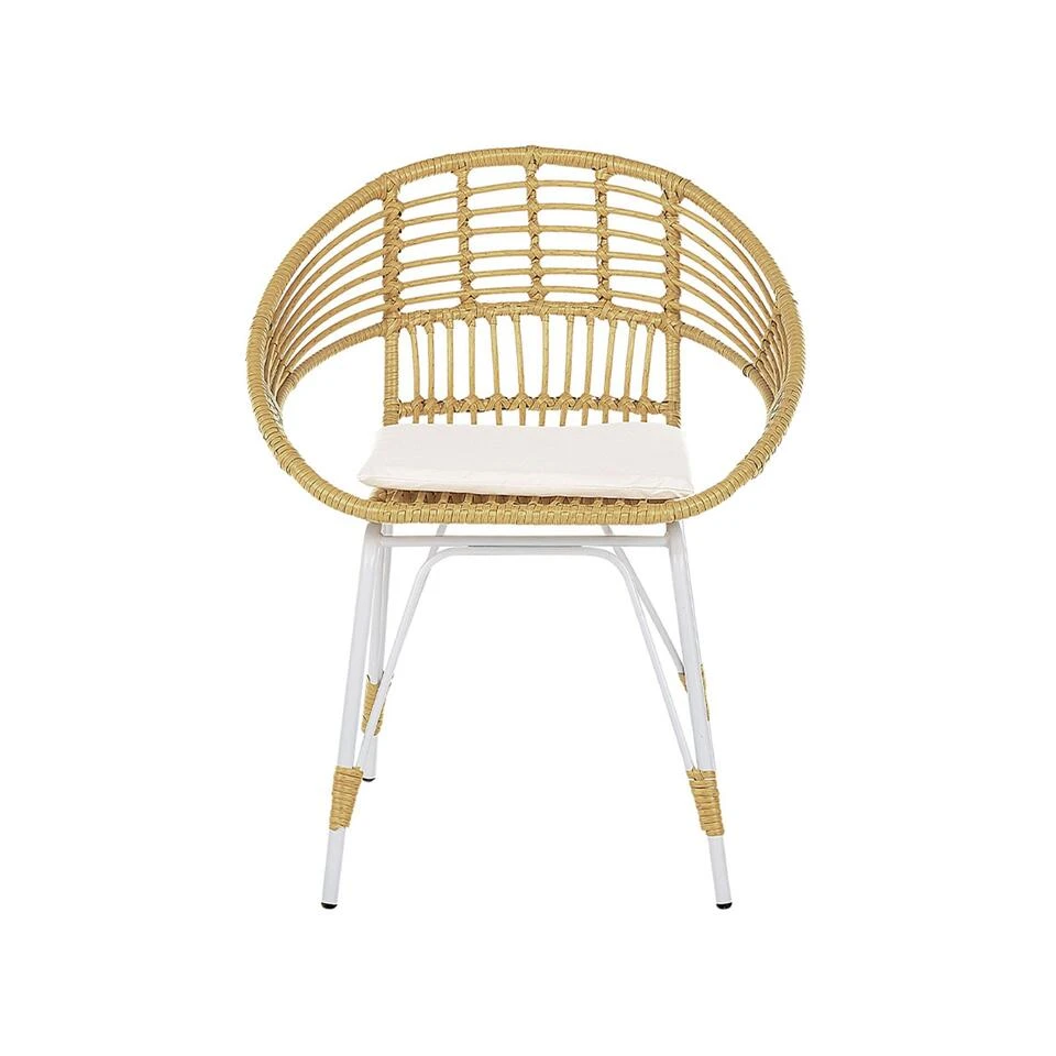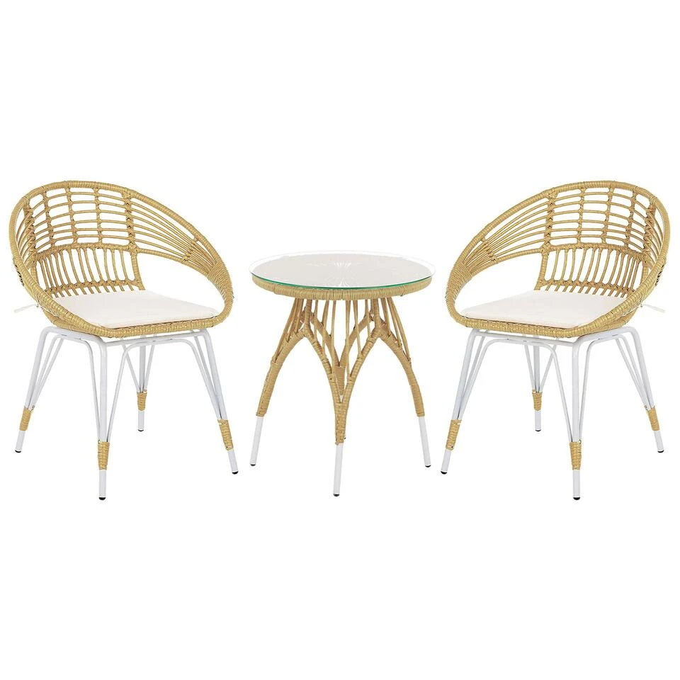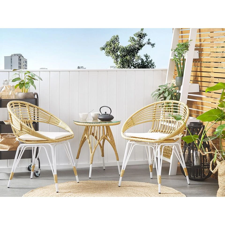 Modern kunststof rotan balkonset met 2 stoelen en glazen tafelblad. Creëer een gezellige relaxplek op je balkon met dit boho-geïnspireerde balkonset. De stoelen en salontafel zijn gemaakt van faux rotan, wat naast de chique uitstraling ook bijzonder onderhoudsvriendelijk is. De constructie is heeft een stevig gepoedercoat metalen frame met beschermende pootdoppen die krassen op je vloer voorkomen. De brede zittingen van de stoelen zijn voorzien van waterafstotende kussens, zodat je heerlijk comfortabel kunt ontspannen met een kopje koffie.