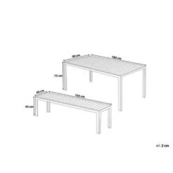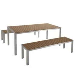 Outdoor eettafel met banken. Een praktische set bestaande uit een tafel en twee banken maakt de tuin, terras of patio elegant. De set is gemaakt van duurzame materialen. Door de combinatie van geanodiseerd aluminium en kunsthout gaan de meubels lang mee. Zeker wanneer je de meubels goed onderhoudt.
