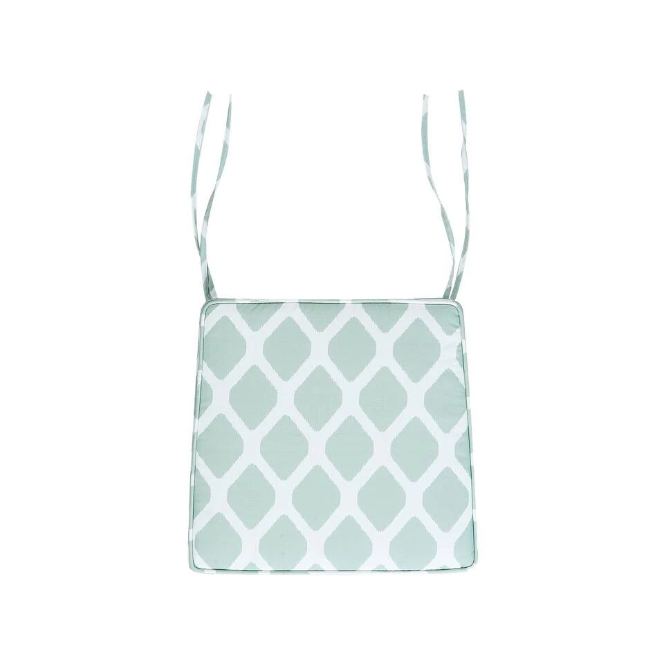 Set gewatteerde buitenkussens. Geen tuinmeubel is compleet zonder een zitkussen dat voor extra comfort zorgt. Deze set met geometrisch ruitpatroon voor een tuinstoel is voorzien van een dikke vulling voor comfortabel zitten. Met de banden kun je de onderdelen eenvoudig aan het frame van de stoelen bevestigen. Het opvallende patroon in een subtiele muntkleur brengt zomerse charme in elke buitenruimte.