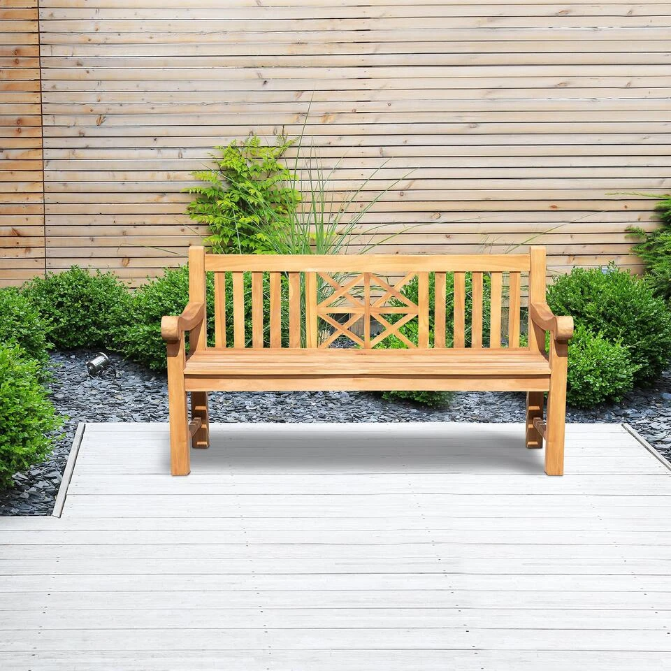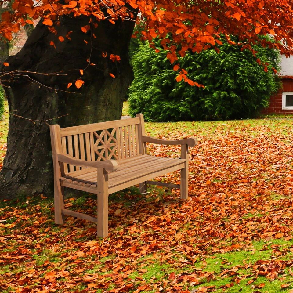 Zo n solide, massieve teakhouten bank is gewoon een deel van elke tuin. Met zijn tijdloze design past deze tuinbank overal perfect in beeld en kan hij ook harmonieus worden gecombineerd met bestaand terras of tuinmeubilair. De licht gebogen bank, de aangenaam liggende rugleuning en de gebogen armleuningen geven de teakhouten bank een ergonomisch zitcomfort. De stevige poten bestaan uit massief houten balken van 5×5 cm dik. Het kostbare houtteak is een extreem hoogwaardig en duurzaam materiaal. Uw teakhouten tuinmeubilair kan daarom zelfs het hele jaar door buiten zijn. Voor permanent onderhoud van de kleur teak worden geschikte onderhoudsoliën aanbevolen, die u desgewenst in de handel verkrijgt.