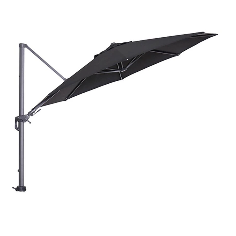 Wil je echt helemaal kunnen genieten in de tuin? Dan is de Hawaii parasol van kwaliteitsmerk Garden Impressions onmisbaar. Iedereen heeft af en toe de behoefte om de verkoeling van de schaduw op te zoeken. Met de Hawaii zweefparasol is dit kinderlijk eenvoudig. Deze zweefparasol zet je met gemak schuin (horizontaal en verticaal) in iedere gewenste stand en je draait hem gemakkelijk (360 graden) rond. De Hawaii parasol is gemaakt van hoogwaardige kwaliteit materialen. De parasol beschikt over een 250 grams polyester doek wat zorgt voor bescherming tegen de zon. Verkleuring van het doek door de zon is na verloop van tijd niet tegen te gaan. Bovendien is het doek voorzien van een brandwerende PA-coating en een windvanger, zodat de wind goed weg kan als deze onder de parasol komt. Het parasoldoek is spatwaterdicht. Het dikke aluminium frame is voorzien van een hoogwaardige kwaliteit poeder coating. Deze coating is dusdanig sterk dat het kras- en stootvast is. De baleinen van de parasol zijn voorzien van doekspanners, zodat het doek mooi strak wordt gehouden. De Hawaii parasol hoef je in principe niet te verplaatsen, want vanuit één positie creëer je schaduw waar deze nodig is. De Hawaii parasol van Garden Impressions zet je gemakkelijk schuin, door middel van het handvat schuif je het doek in verschillende standen schuin tot bijna 90 graden. Daarnaast kun je hem ook nog eens horizontaal verstellen. Bovendien kun je de Hawaii parasol ook nog eens 360 graden rond draaien. Na gebruik kun je gebruik maken van een Hawaii parasolhoes welke los aangeschaft kan worden, hierdoor kun je de parasol tijdens zonnige dagen buiten laten staan. Bij slecht weer til je deze zweef parasol gemakkelijk van de voet en berg je deze op in de schuur. Bij de Hawaii parasol zijn verschillende voeten verkrijgbaar om de parasol stevig in de tuin te plaatsen. Je kunt kiezen uit een kruisvoet, grondanker of een luxe granieten voet met wielen. Voor deze grote Hawaii parasol kun je het beste een Hawaii voet aanschaffen van minimaal 90 kg. Wanneer er meer wind staat op het terras dan is een voet van 120 kg beter geschikt. De totale hoogte van deze parasol is 250 cm, de doorloop hoogte is 205 cm. Het zwart kleurig doek heeft een diameter van 350 cm.