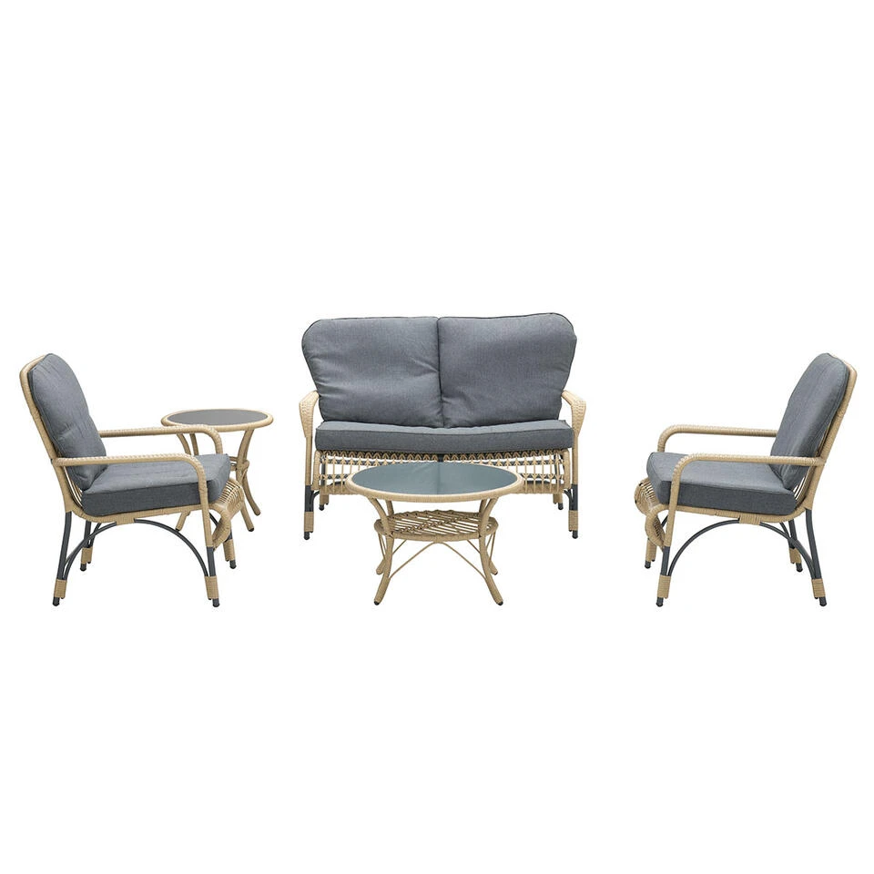 De loungeset wordt geleverd met een mooie loungetafel. Deze tafel is hetzelfde vormgegeven als de set en voorzien van een glazen tafelblad. Dit is gehard glas en gaat niet zomaar kapot. Daarnaast beschikt deze set over waterafstotende dikke loungekussens. Deze zorgen voor een heerlijke comfortabele zit.