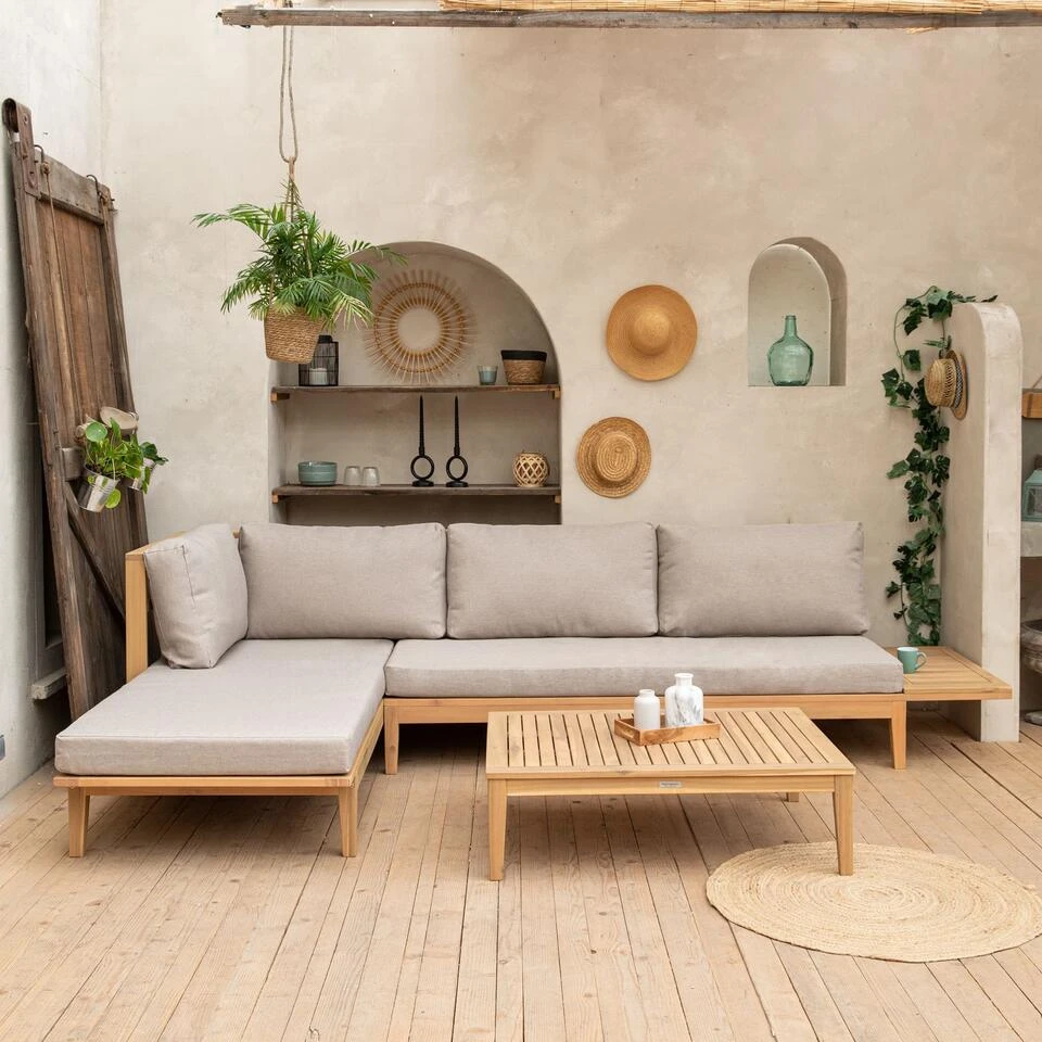 De PANGKOR 4-zits tuinmeubelset in acacia is de perfecte manier om een ontspannende en gezellige ruimte in uw tuin of op uw terras te creëren. Hij bestaat uit een bank, een chaise longue en een salontafel van acacia, een natuurlijk sterk en duurzaam hout dat bestand is tegen buitenomstandigheden. De set is ontworpen voor maximaal 4 personen, dankzij de zachte zitkussens die u optimaal comfort zullen bieden. De kussens zijn verkrijgbaar in een stijlvolle en tijdloze kleur die past bij elke buiteninrichting. De salontafel is een praktische plek om uw drankjes en verfrissingen op een warme zomerdag op te zetten.