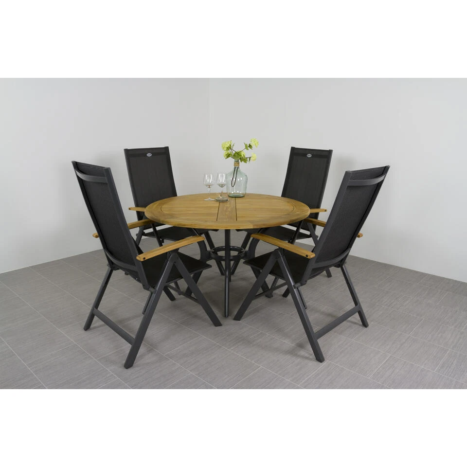 De tuinset bestaat uit de ronde tuintafel South Wales 120 cm. doorsnede en 4 keer de verstelbare tuinstoel Napoli. De ronde tuinset maakt je tuin erg gezellig. Dit komt omdat je iedereen aan de tafel aan kunt kijken. Kortom de ideaale tuinset voor uw terras.Â