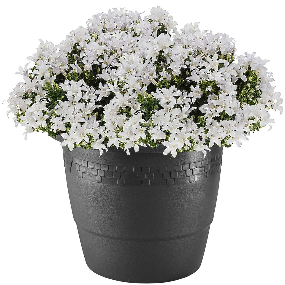 Bloempot/plantenpot antraciet grijs kunststof diameter 35 cm en hoogte 29 cm. Met decoratieve rand. De pot wordt geleverd zonder gaatjes in de bodem, deze kunt u eventueel zelf boren zodat overtollig water kan weglopen. Bij gebruik op een tafel wordt een onderzetter/onderschaal aangeraden indien u gaatjes in de pot heeft geboord. Voor binnen of buiten gebruik.