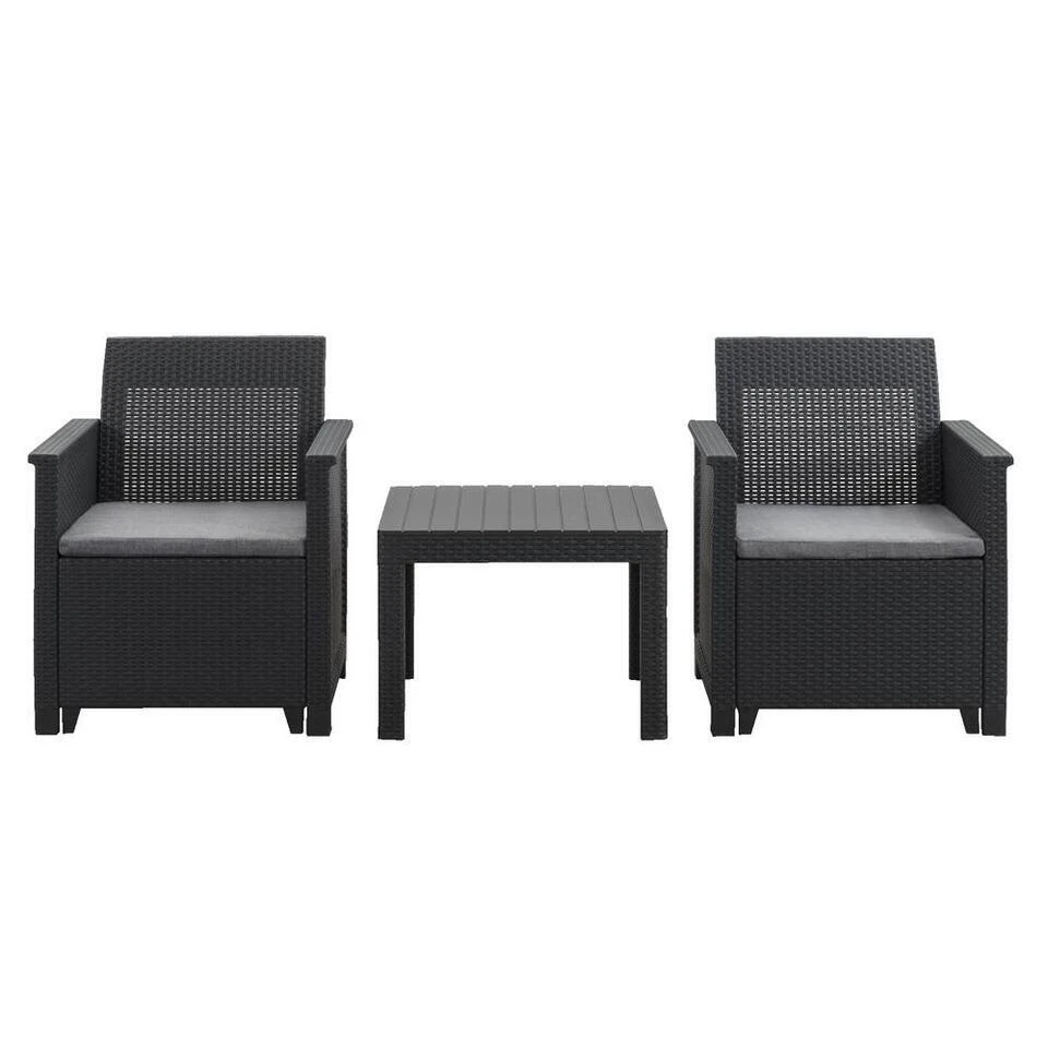 Tuinset Emma bestaat uit 2 fauteuils en een tafel. Deze loungeset biedt ruimte aan 2 personen. De Emma tuinmeubelen zijn gemaakt van gerecycled kunststof wicker, zijn antraciet van kleur en worden geleverd inclusief kussens voor optimale comfort. Deze loungemeubelen zijn duurzaam, onderhoudsarm en weersbestendig, de perfecte tuinset voor de zomer!