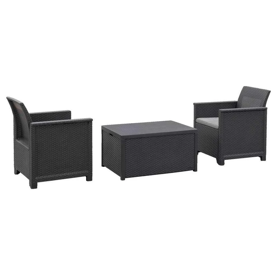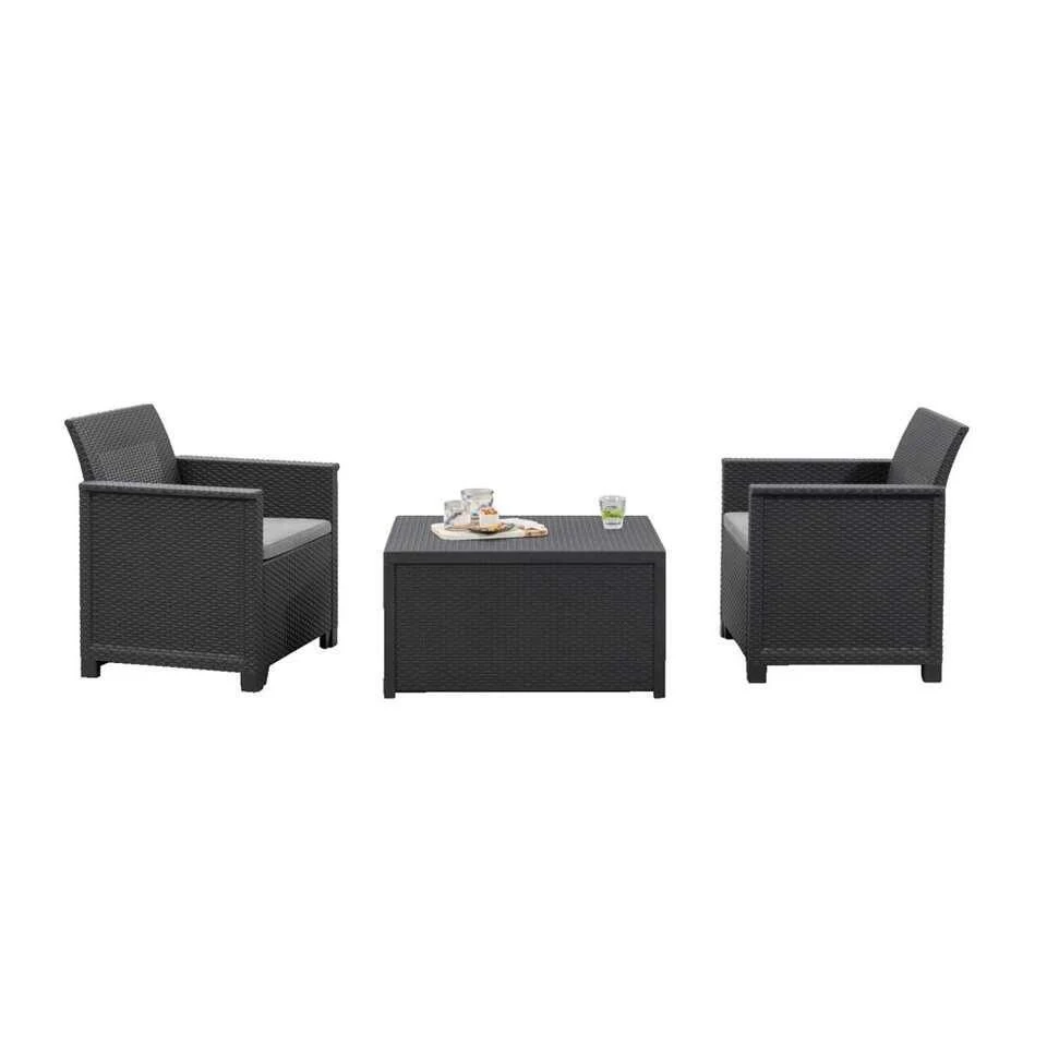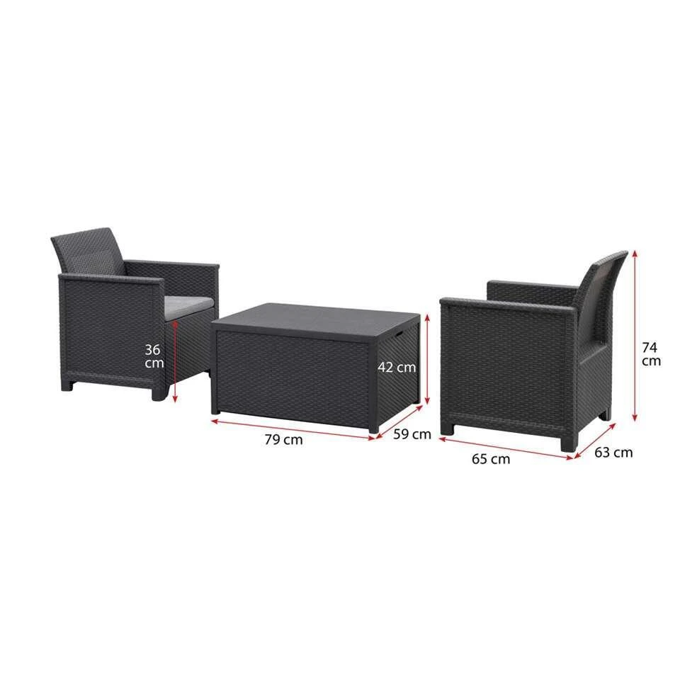 Loungeset Emma bestaat uit 2 loungefauteuils en een opbergbox/tafel Arica. Deze loungeset biedt ruimte aan 2 personen. De Emma tuinmeubelen zijn gemaakt van gerecycled kunststof wicker, zijn antraciet van kleur en worden geleverd inclusief kussens voor optimale comfort. Deze loungemeubelen zijn duurzaam, onderhoudsarm en weersbestendig, de perfecte loungeset voor de zomer!
