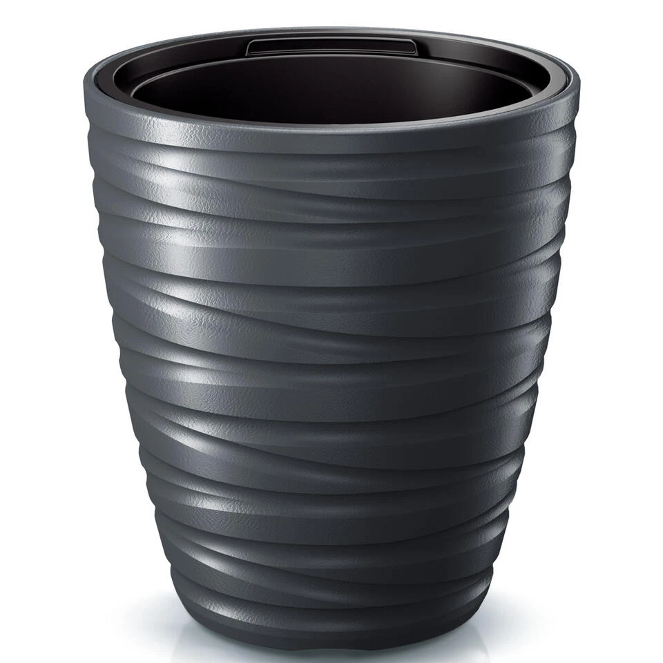 Plantenpot/bloempot uit de Amazing collectie is gemaakt van PP kunststof in de kleur antraciet met een golvend strepen patroon aan de buitenzijde. Deze prachtige ronde bloempot is echt een schitterende toevoeging aan uw tuin/terras/huis. De bloempot is voor buiten en binnen gebruik geschikt en heeft een losse binnenpot met hendels. De kunststof constructie van de plantenpot maakt dat de pot licht van gewicht is, waardoor hij makkelijk is te verplaatsten. Formaat: Diameter 30 cm x Hoogte 33 cm. UV en vorst bestendig.