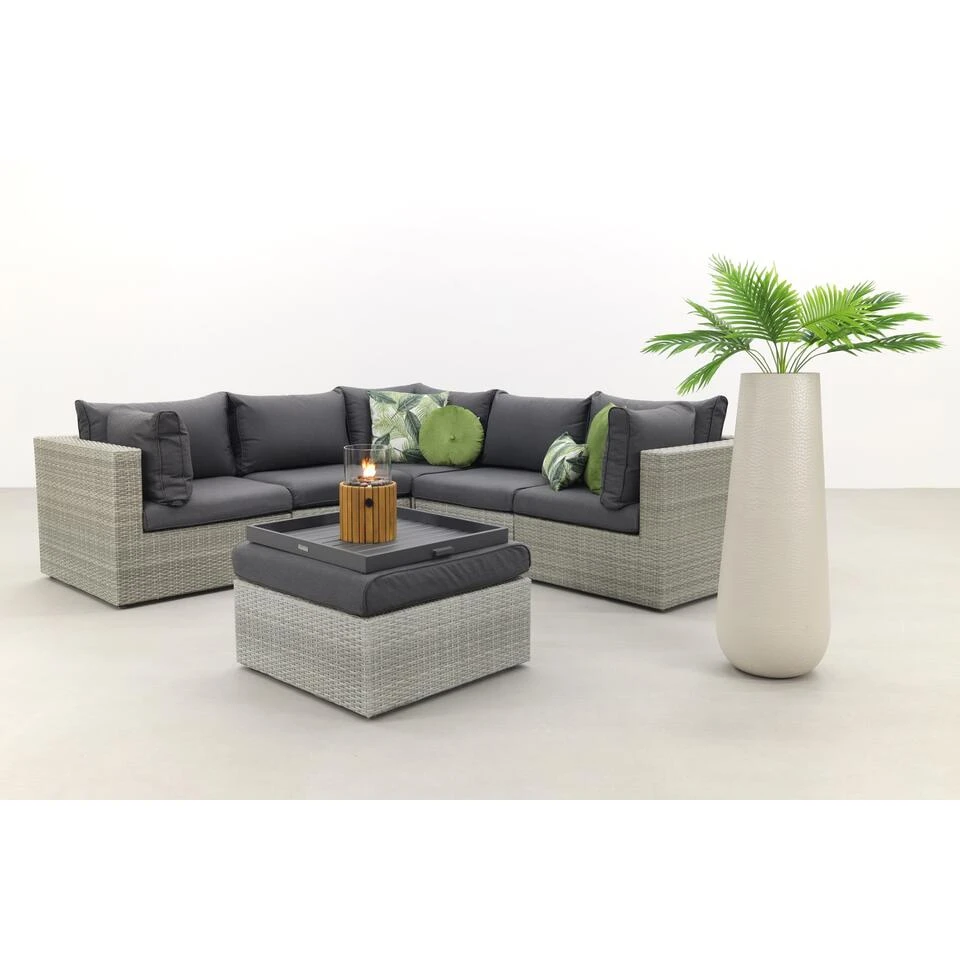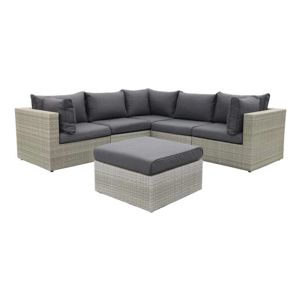 Super mooi loungeset met extra stevige kussens. De kussens hebben een water en vuil afstotende coating wat ervoor zorgt dat de kussens beter beschermt zijn tegen vocht en vuil. De loungeset bestaat uit losse elementen wat ervoor zorgt dat de bank extra stevig is. De element zijn overigens aan elkaar te koppelen.Â