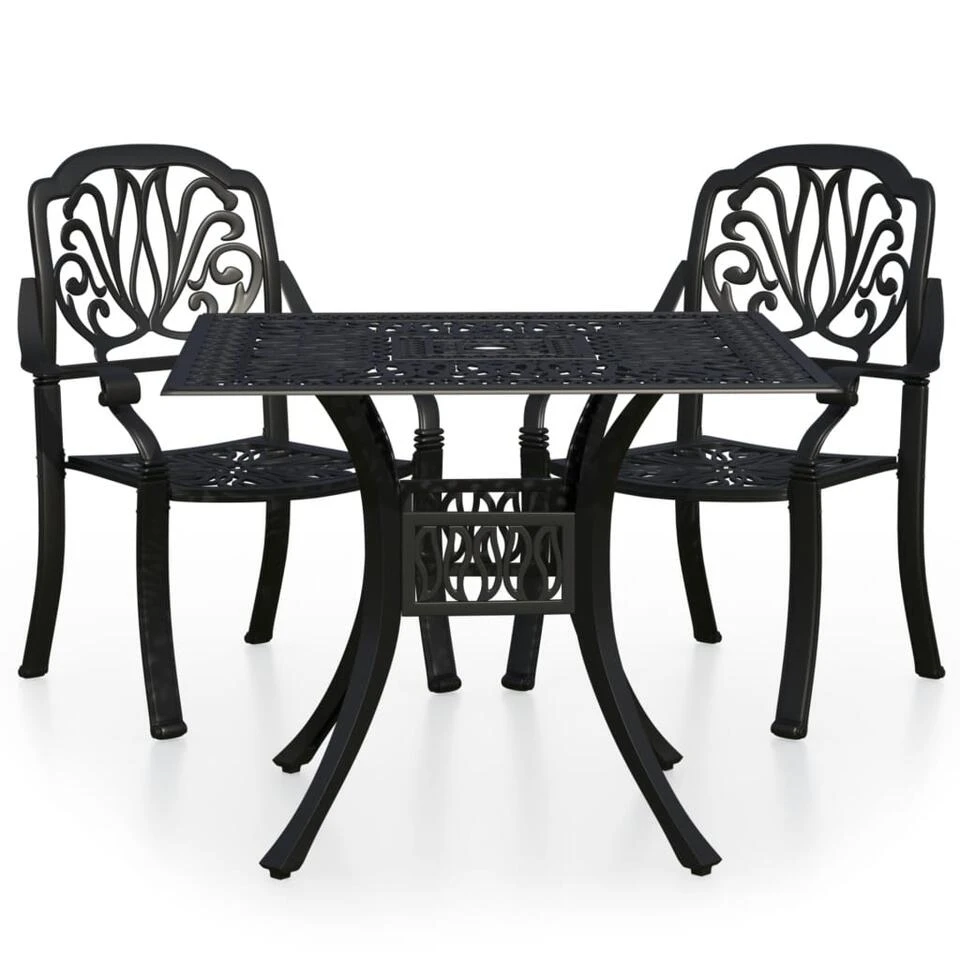 De tuinstoelen en -tafel zijn gemaakt van gietaluminium waardoor ze zowel stevig als duurzaam zijn. Het roest- en weerbestendige materiaal maakt de meubelset ideaal voor buitengebruik. De prachtige patronen maken van de set een elegante aanvulling op je buitenruimte. Bovendien heeft de tafel een parasolgat waar je parasol perfect in past, om je te beschermen tegen zon of regen.