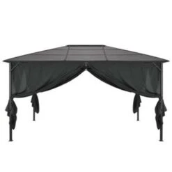 Het dak, gemaakt van 6 mm dik uv-bestendig pc-bord, beschermt je tegen de schittering en schadelijke uv-stralen van de zon. Het prieel is stevig geconstrueerd van sterk aluminium en staal, en is daardoor bestand tegen roest en zeer stabiel. Het tuinpaviljoen wordt geleverd met 4 zijwanden, die bij slecht weer kunnen worden ingetrokken. Klittenband is ook inbegrepen voor eenvoudige bevestiging van de gordijnen.