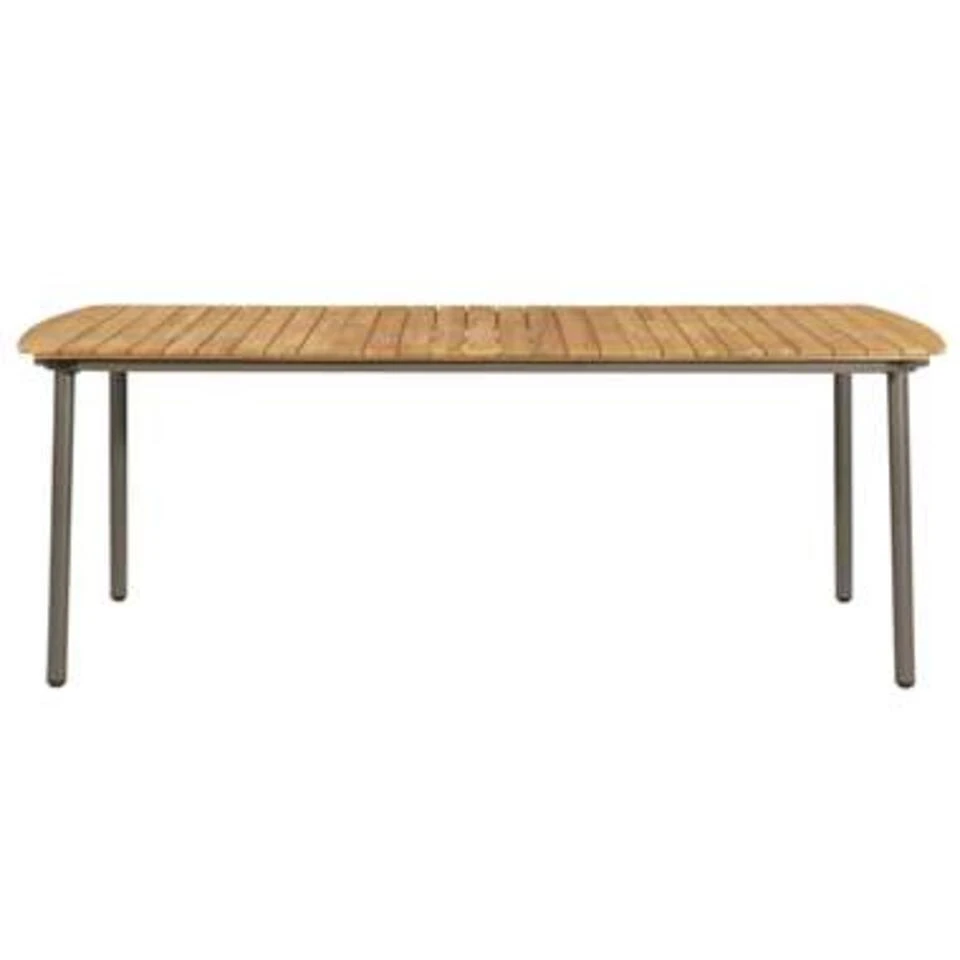 De tafel is gemaakt van massief acaciahout met een olieafwerking en heeft een lattenpatroon. Het stalen frame maakt de tafel stevig en stabiel en geeft hem een industriële uitstraling. De eettafel is eenvoudig te monteren en te onderhouden.